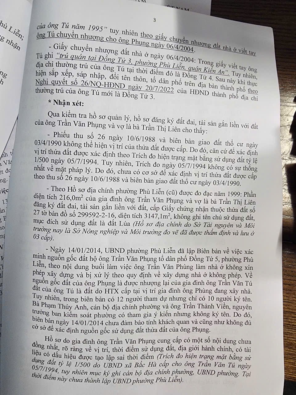 Sự việc trở nên căng thẳng khi có sự “vênh nhau” giữa tài liệu của người dân cung cấp và hồ sơ quản lý của địa phương. Ông Phụng đưa ra các bằng chứng "sống" như: Phiếu thu số 26 ngày 10/6/1988 nộp lệ phí đất thổ cư, Biên bản giao đất của HTX Đồng Sơn năm 1990, Biên bản xác minh nguồn gốc đất của UBND phường Phù Liễn cũ xác nhận ngày 19/01/2014, biên bản của Hội đồng đăng ký đất đai của UBND phường Bắc Hà (nay là phường Phù Liễn) cùng các giấy tờ khác của chính quyền địa phương xác nhận đã có hiệu lực pháp luật. Thế nhưng, tại văn bản số 127, ông Bùi Anh Phong là Trưởng phòng kinh tế, hạ tầng và đô thị phường Phù Liễn cho rằng, tại phiếu thu số 26 của gia đình ông Phụng "không thể hiện vị trí thửa đất" mặc dù đây chỉ là phiếu thu tiền chứng minh người dân đã nộp tiền vào ngân sách nhà nước, trích đo năm 1994 có dấu hiệu "tạo lập sai thời điểm" do tại thời điểm đó (1994) chưa thành lập UBND phường Phù Liễn, mặc dù phóng viên thẩm thị tận mắt là dòng chữ “phường” đó là chữ in máy chứ không phải viết tay.