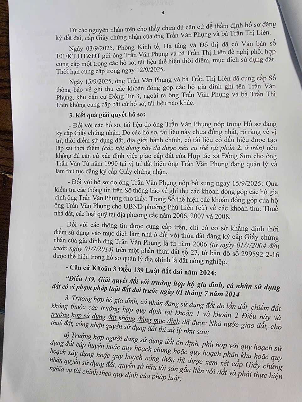 Trong đơn kêu cứu, ông Phụng nhấn mạnh: "Việc dẫn dắt đưa đất ở hợp pháp của gia đình tôi vào diện vi phạm pháp luật tại Điều 139 Luật Đất đai 2024 là hành vi áp đặt, lạm quyền, gây thiệt hại nghiêm trọng đến kinh tế gia đình". Không những thế sau khi phía ông Phụng nộp Đơn khiếu nại ngày 05/9/2025 để khiếu nại nhưng đến nay Chủ tịch UBND phường Phù Liễn chưa một lần đối thoại, trao đổi hay phản hồi.