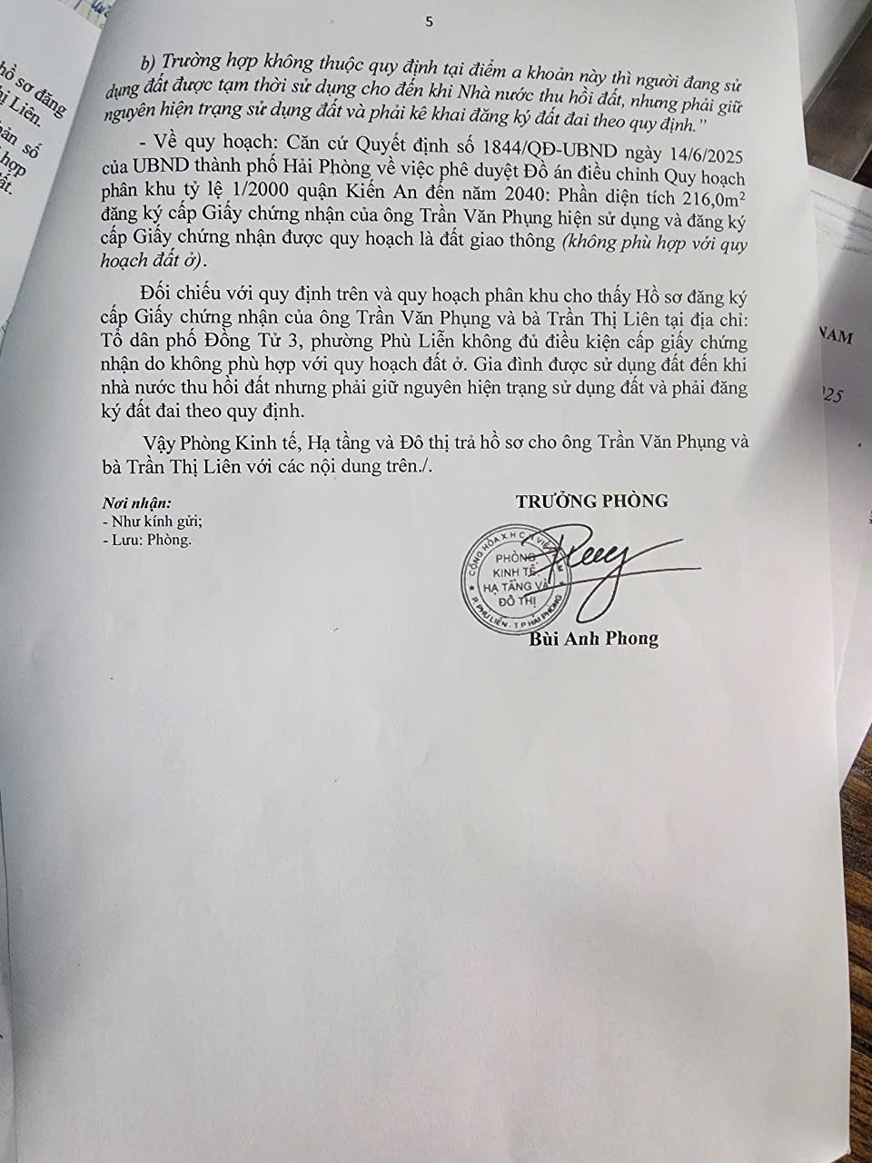 Đặc biệt, "gáo nước lạnh" dội vào hy vọng của gia đình ông Phụng là Phòng Kinh tế, hạ tầng và đô thị đưa ra căn cứ đối chiếu với Quy hoạch phân khu quận Kiến An đến năm 2040 (phê duyệt ngày 14/06/2025), lý do đưa ra là phần diện tích ông Phụng đang sử dụng được quy hoạch là đất giao thông, không phù hợp với quy hoạch đất ở.